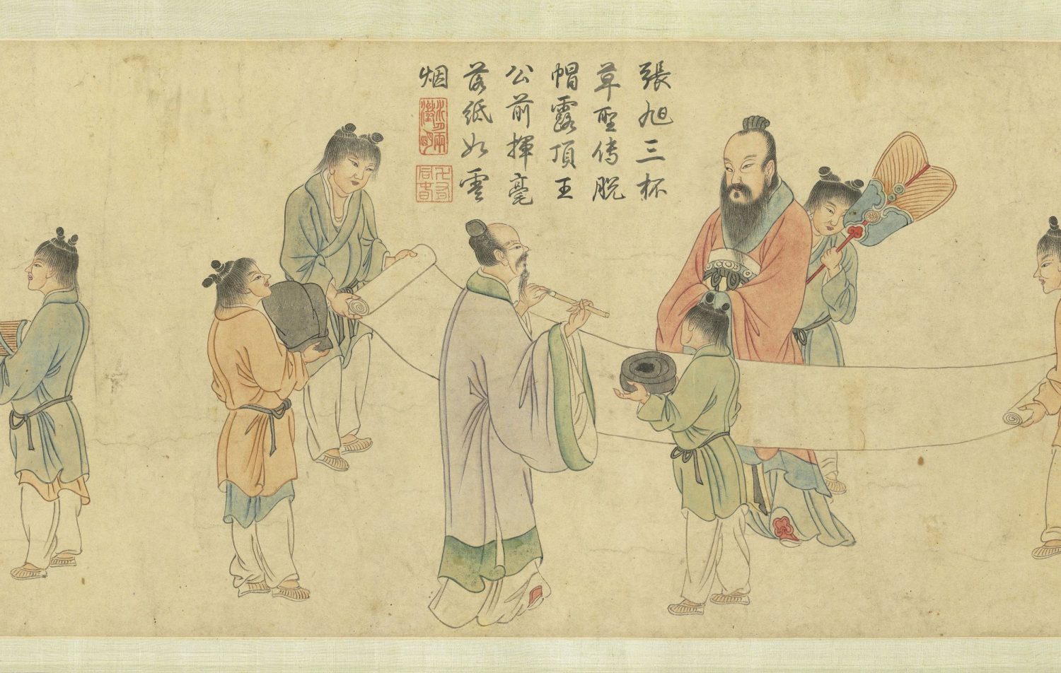 三杯草圣传,脱帽露顶王公前,挥毫落纸如云烟。