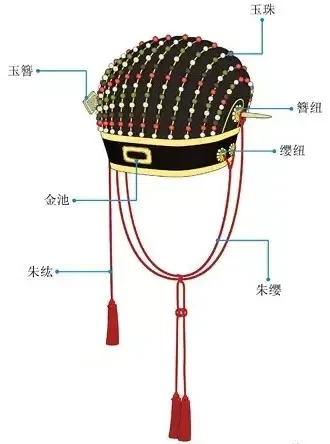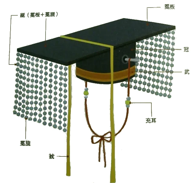 古人礼服有两套相目的佩玉,腰左右各佩一套,用丝绳系着,上端是弧形的玉叫“珩”(héng),珩的两端各悬着一枚半圆形的玉叫“璜”,中间缀着两片玉,叫“琚”(jū)和“瑀”(yǔ),两璜之间悬着一块两头尖中间大的玉,叫“冲牙”,这样走起路来冲牙与两璜相触,发出铿锵悦耳的声音。为了不使璜前后摆动太大、远离了冲牙,又用两根丝绳系在珩的两头,从瑀的中心穿过,并拴住两璜。